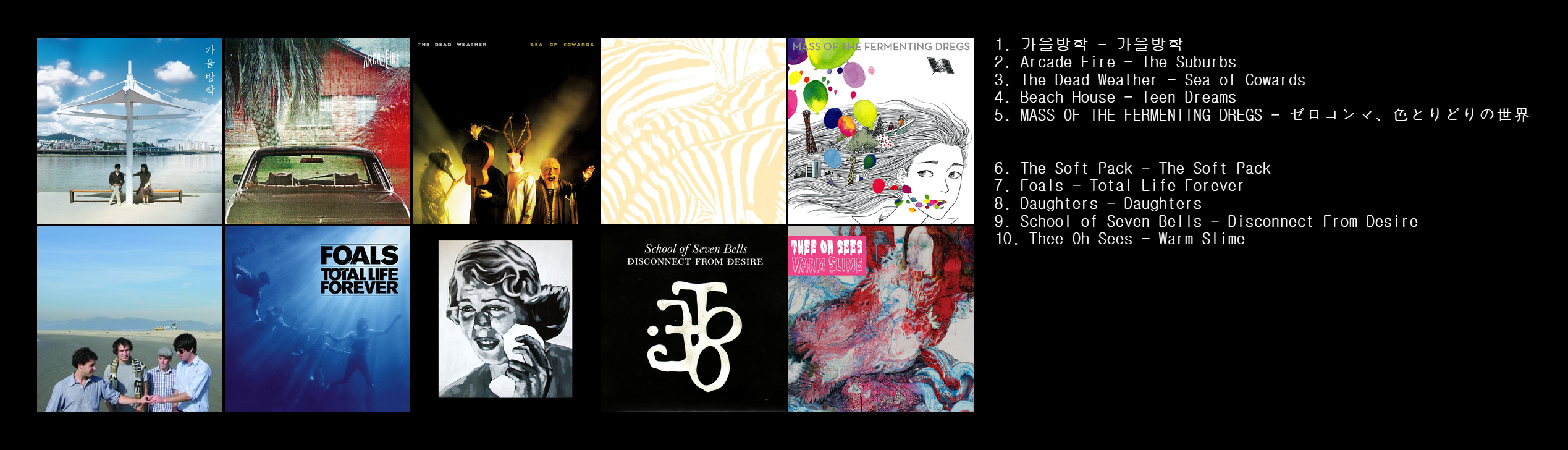 지난번 검정치마 리뷰에 너무 공을 들였는지 뭔가 새로운 앨범 리뷰 쓸 글감이 딱히 잡히는게 없어서 간단하게 2010년도 부터 그해 앨범들 총 결산 시리즈를 올려보려고 합니다.