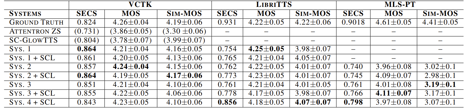 - 이때 SCL을 추가적으로 도입하는 경우 similarity가 향상됨 - LibriTTS에서는 System 4가 우수한 합성 품질을 보임