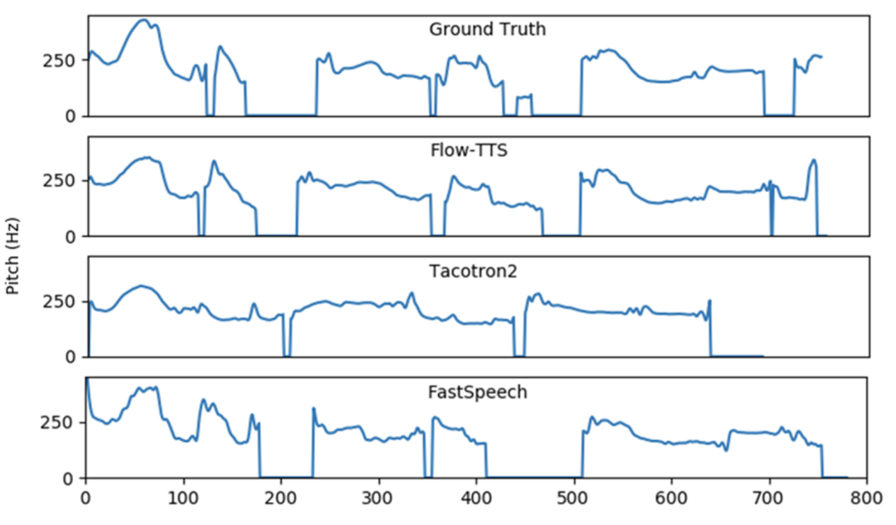 - 합성된 mel-spectrogram을 ground-truth와 비교해 보면Flow-TTS로 합성된 음성의 prosody는 ground-truth와 유사하게 나타남