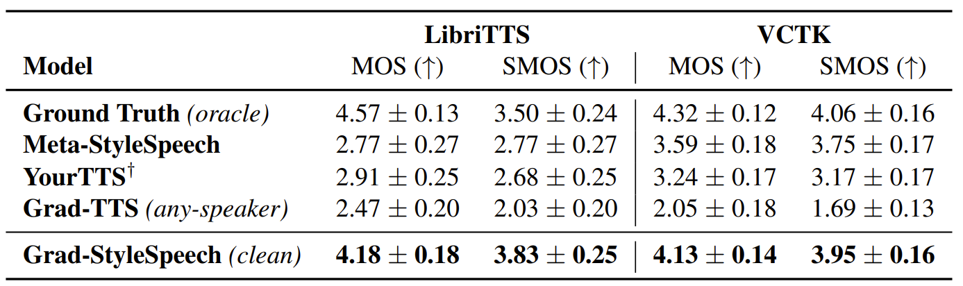 - MOS 측면의 주관적 합성 품질 비교에서도 Grad-StyleSpeech가 가장 우수한 성능을 보임