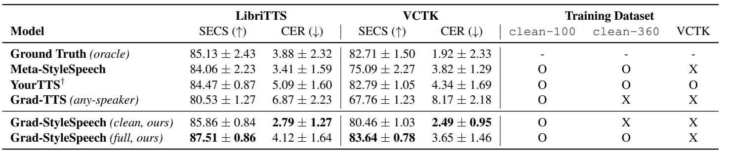 - SECS, CER 측면에서 Grad-StyleSpeech의 성능이 가장 우수한 것으로 나타남