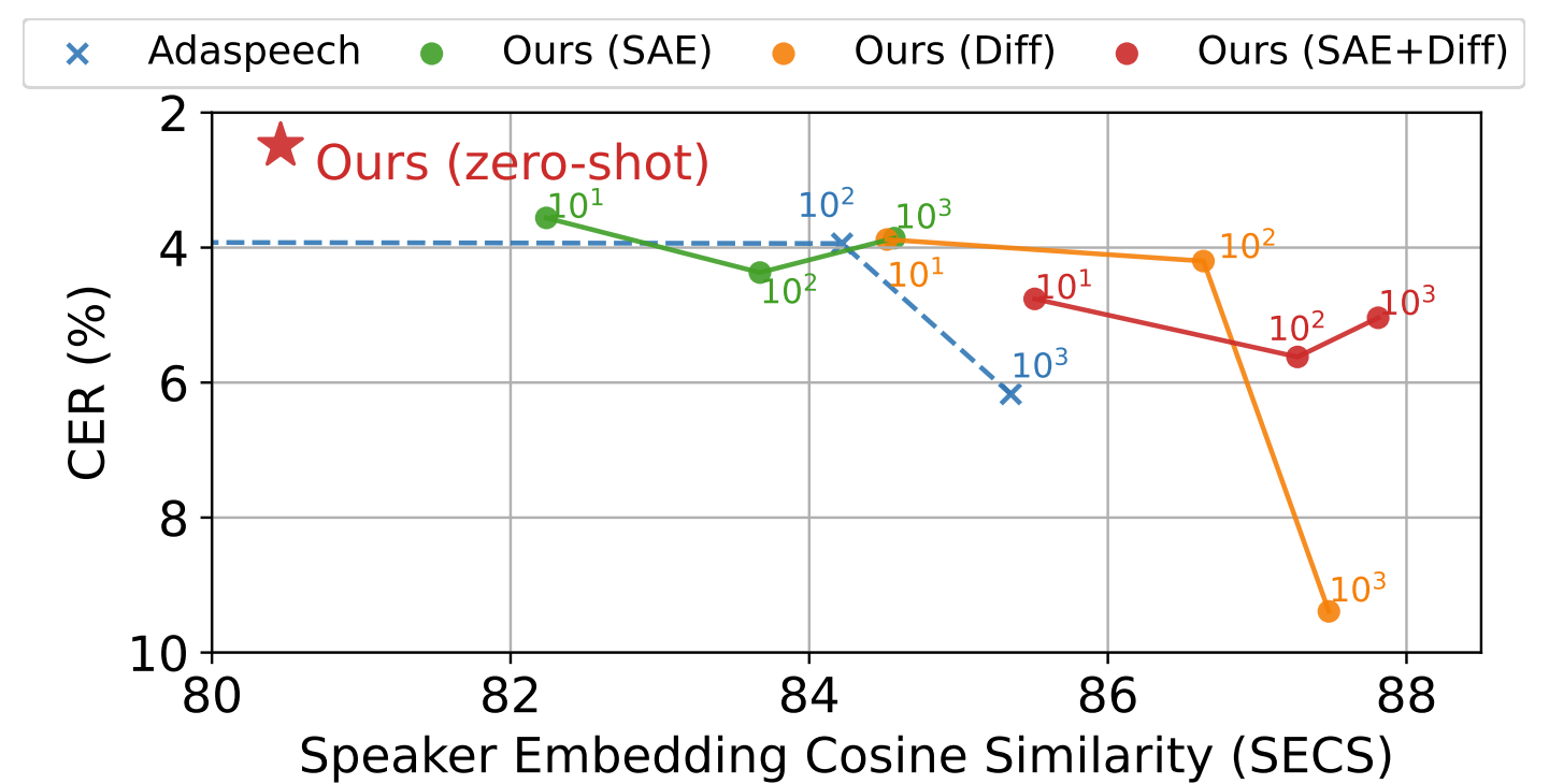 - 이는 any-speaker adaptation 성능이 diffusion model 뿐만 아니라 hierarchical transformer encoder에서도 파생된다는 것을 의미