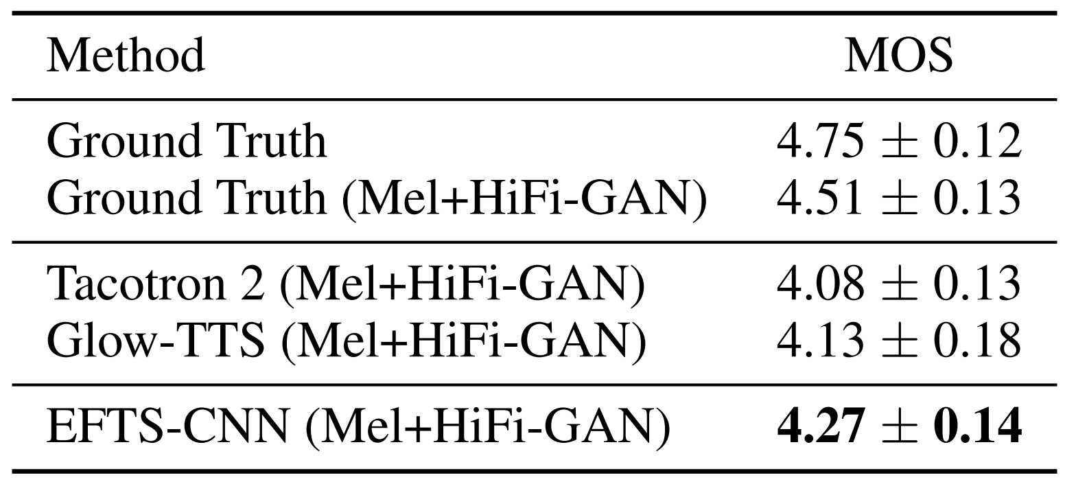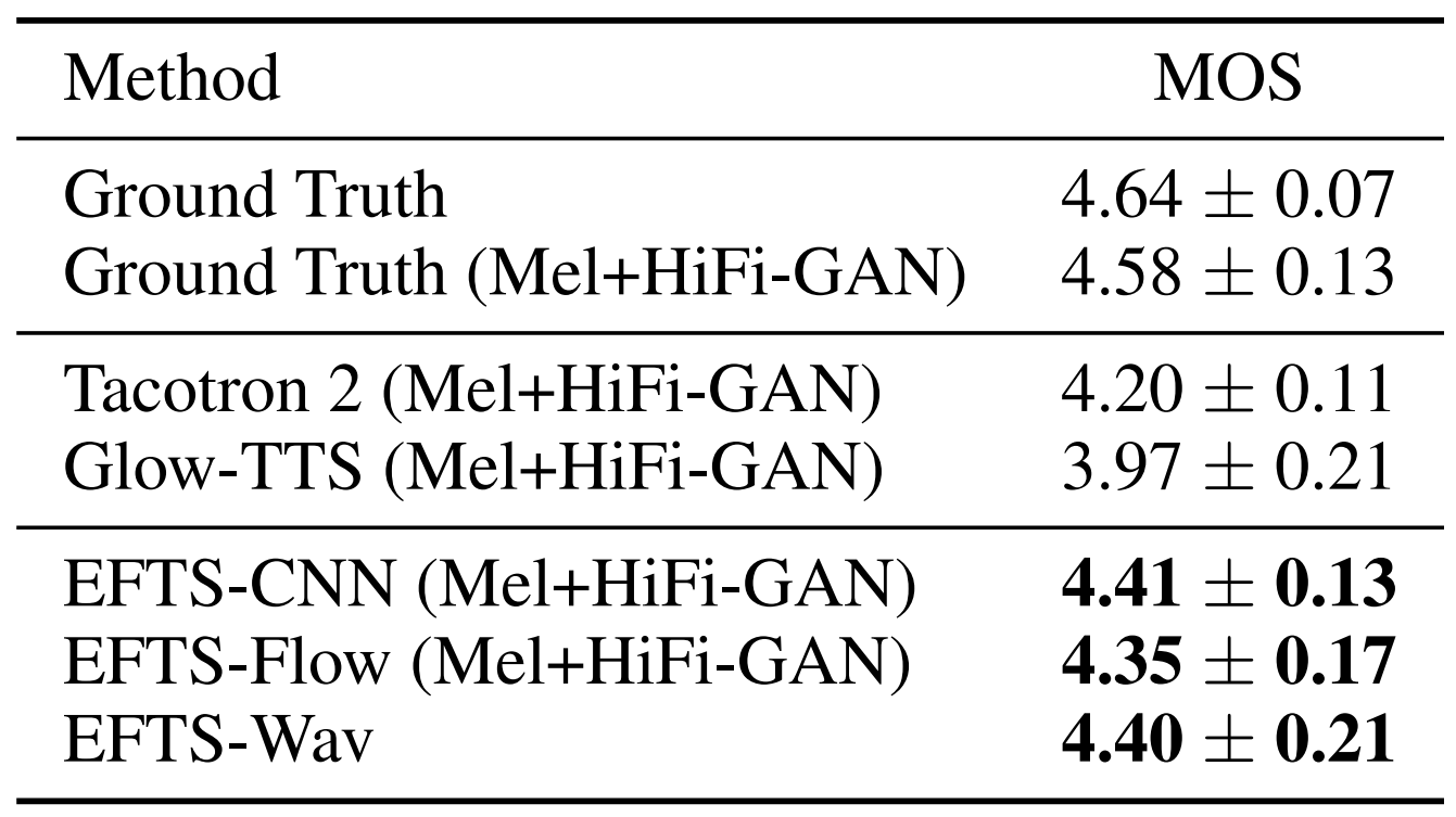 - 결과적으로 EfficientTTS의 합성 품질이 가장 우수한 것으로 나타남