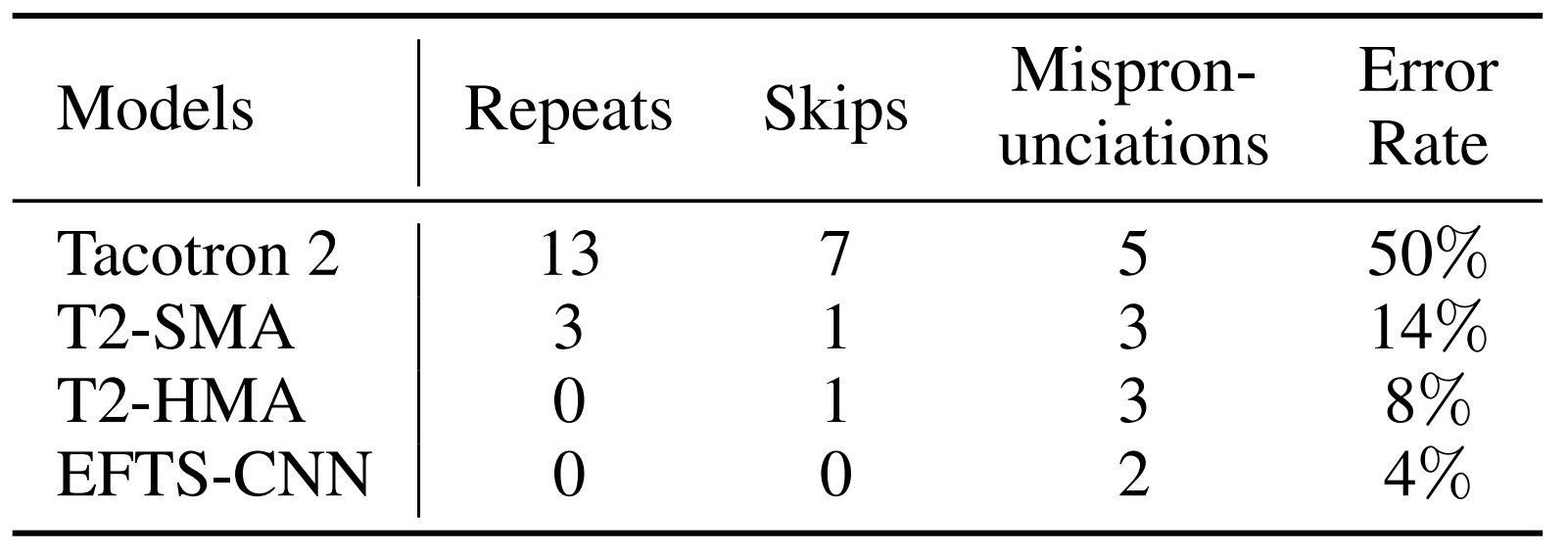 - 특히 SMA, HMA를 Tacotron2에 적용하면, 기존 Tacotron2 보다 더 적은 attention error가 발생하는 것으로 나타남