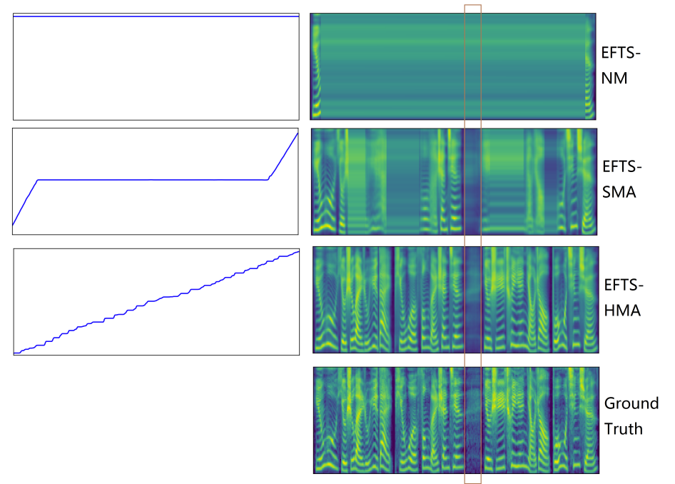 - Monotonicity를 고려하지 않는 EFTS-NM에 비해 EFTS-HMA, EFTS-SMA는 alignment를 학습할 수 있음