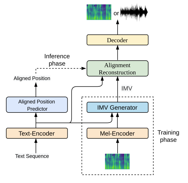 - 이때 Text sequence와 mel-spectrogram의 hidden representation은 각각 text-encoder와 mel-encoder로 얻어짐 - 이후 IMV는 alignment reconstruction layer를 통해 time-aligned representation을 생성하기 위한 2-dimensional alignment matrix로 변환됨