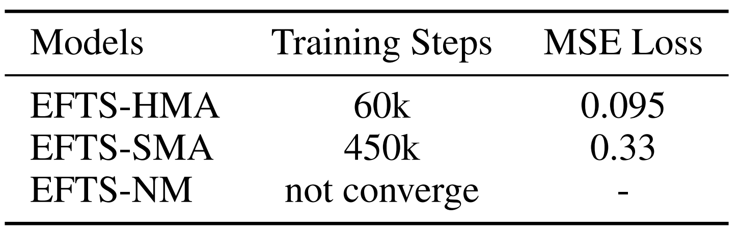 - EFTS-HMA는 EFTS-SMA에 비해 상당한 학습 가속 효과가 있음