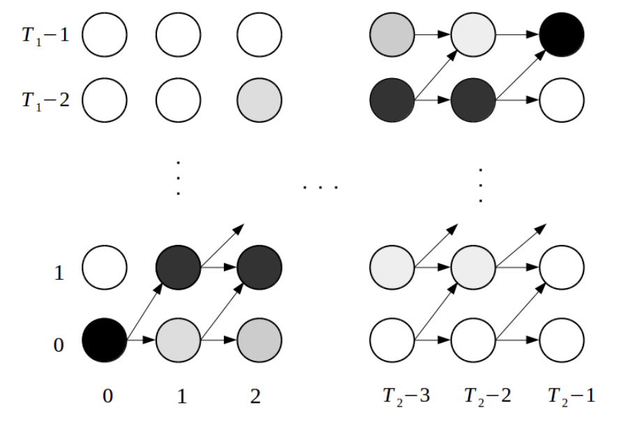 (Eq. 5) $\pi_{T_{2}-1} = T_{1}-1$ - $\alpha_{0} = [1, 0, ..., 0], \alpha_{T_{2}-1} = [0, 0, ..., 1]$로부터 deduce 될 수 있음