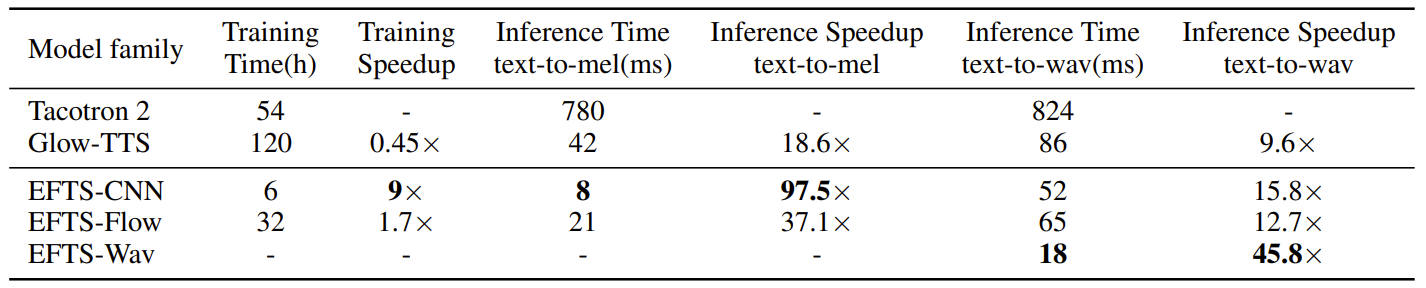 - 추론, 학습 속도 측면에서도 EfficientTTS는 가장 효율적인 것으로 나타남