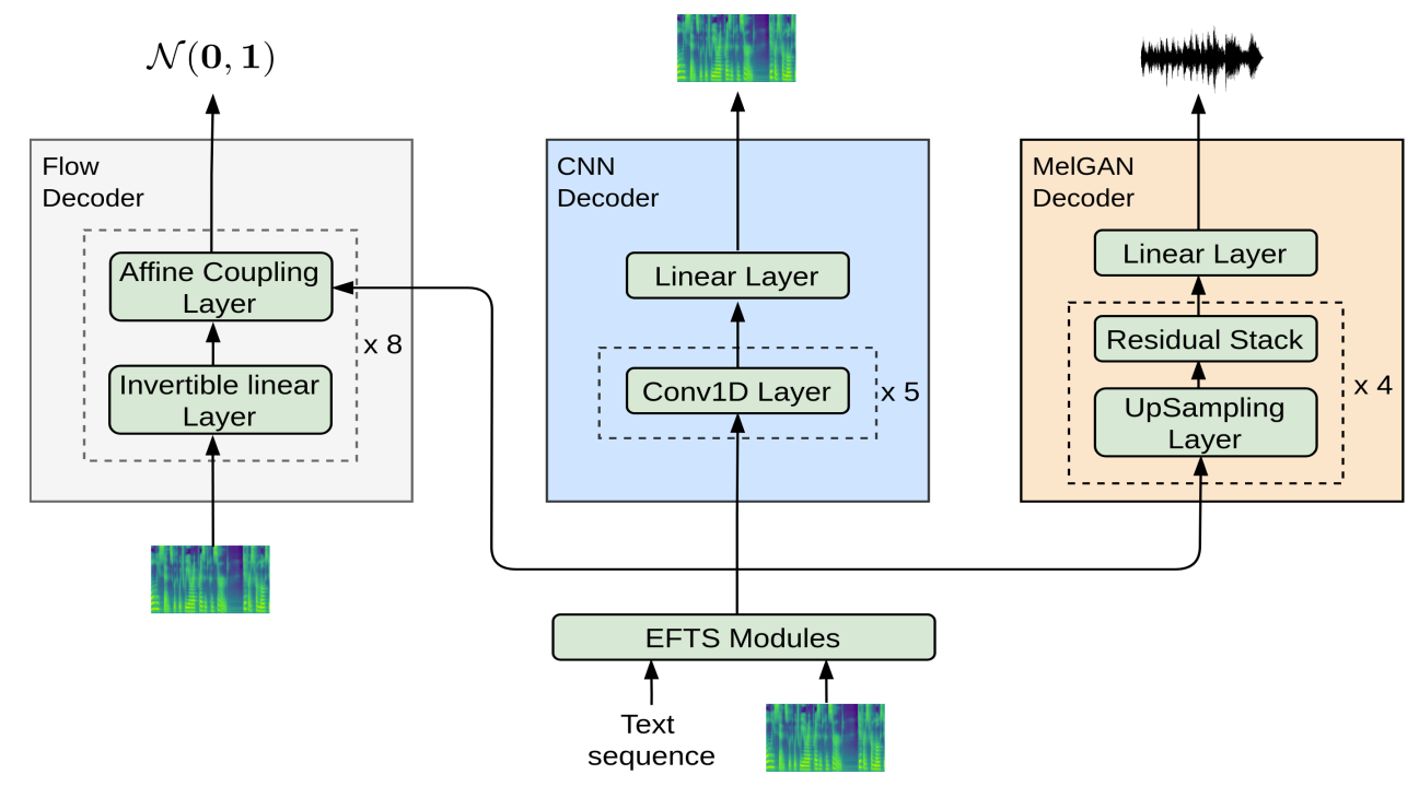 - EfficientTTS를 다양한 feed-forward network 구조와 결합하여 Text-to-Mel-spectrogram, Text-to-Waveform 모두를 지원