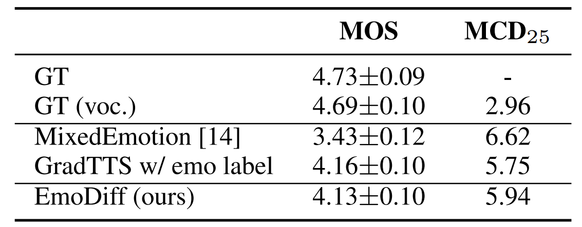 - 합성 품질 측면에서 EmoDiff와 Grad-TTS가 가장 좋은 성능을 보임
