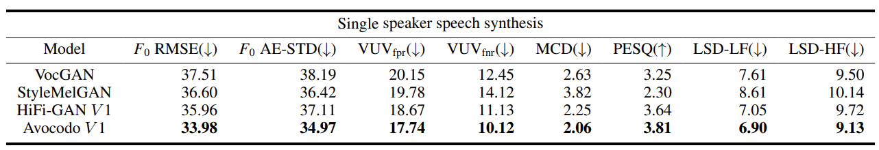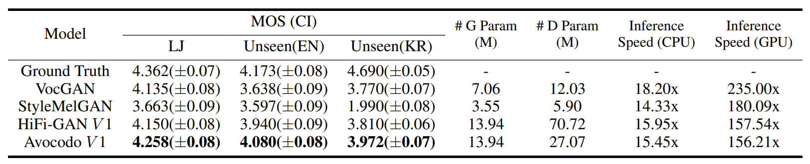 - 결과적으로 Avocodo는 객관적, 주관적 평가 모두에서 가장 우수한 합성 품질을 달성
