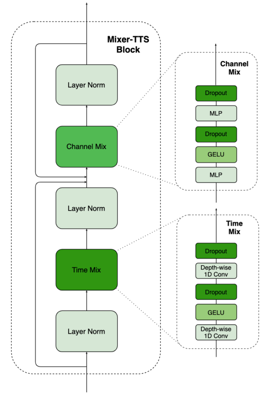 - Encoder와 Decoder의 모든 feed-forward transformer block을 Mixer-TTS block으로 대체