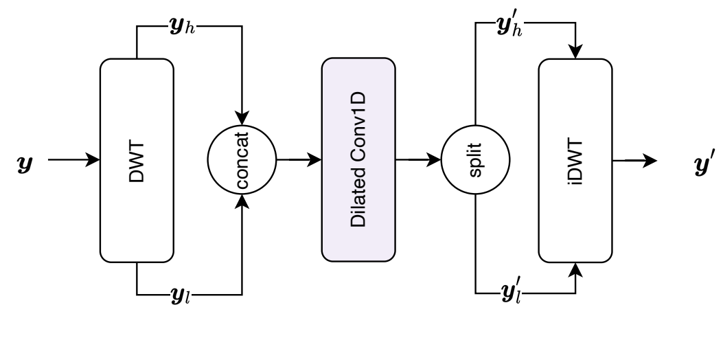 - $\textrm{cat}$ : concatenation operation - 추출된 feature $y_{hidden}$은 channel dimension을 따라 $\{ y'_{l}, y'_{h} \} \subset \mathbb{R}^{\frac{L}{4} \times D}$로 bisect 되고, iDWT는 input feature $y$와 length를 match 하기 위해 abstract feature를 single hidden representation으로 변환: