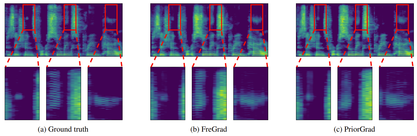 - Mel-spectrogram을 비교해 보면, FreGrad는 정확한 frequency 분포를 reconstruction 할 수 있음