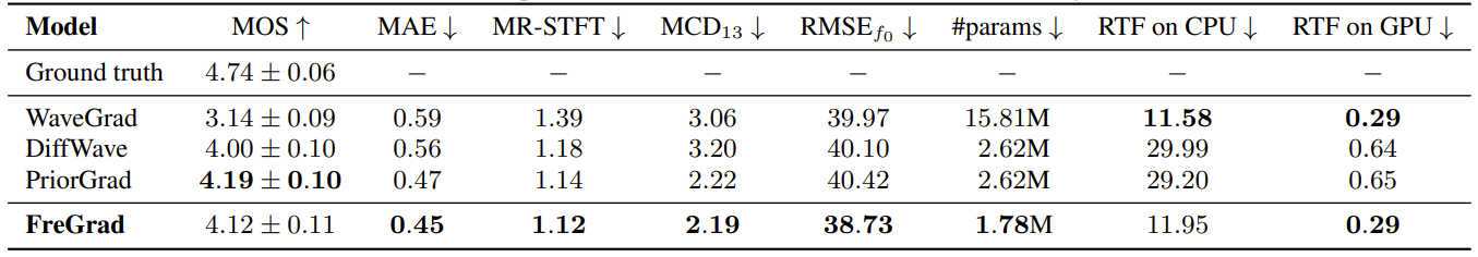 - 합성 품질 측면에서도 FreGrad는 가장 우수한 성능을 보임