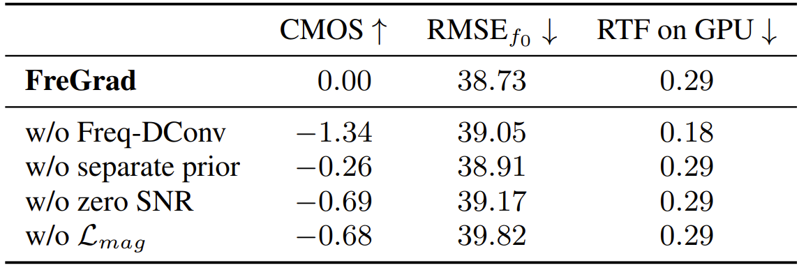 - 논문에서 제안된 각 component는 FreGrad의 합성 품질을 향상하는데 큰 기여를 함