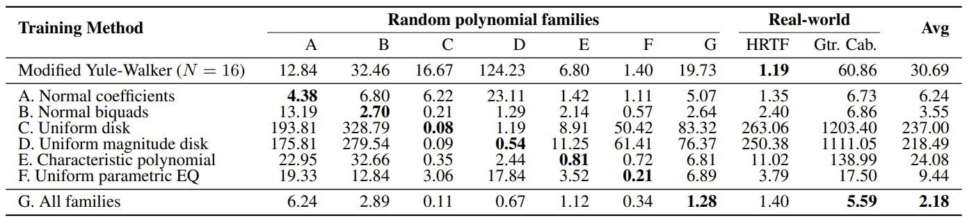 - 추가적으로 모든 filter family ($G$)에 대해 training 된 IIRNet은 가장 낮은 MSE를 달성함