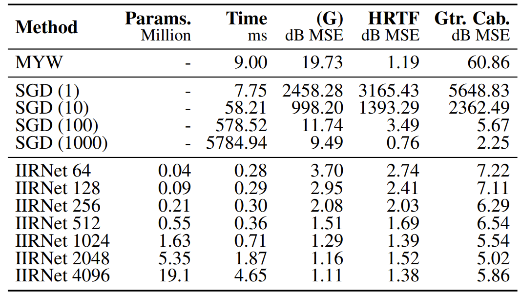 - 특히 IIRNet의 모든 variant들은 SGD, MYW에 비해 더 빠르고 정확함