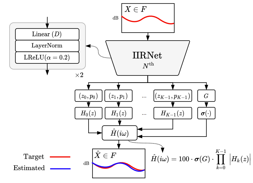 - 여기서 $f_{s}$은 sample rate이고 magnitude response $\hat{X}\in \mathbb{R}^{F}$를 사용하여 $N$-th order digital IIR filter를 추정함