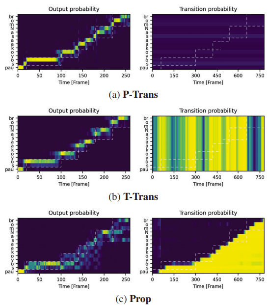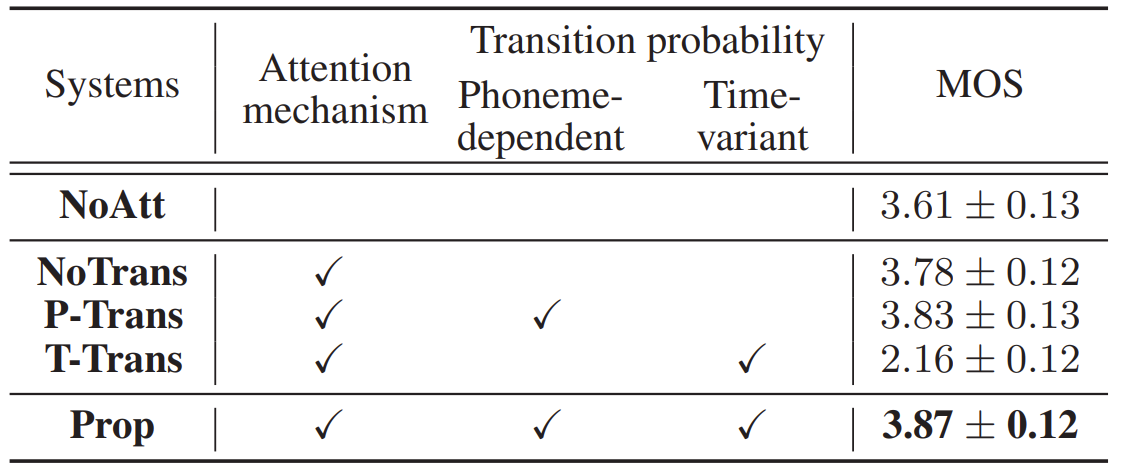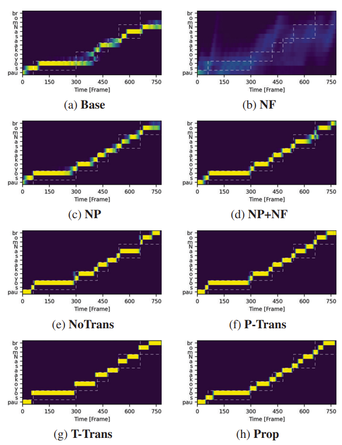 - 제안하는 Prop는 보다 적절한 transition probability를 가지기 때문에 더 정확한 alignment를 얻을 수 있고, 결과적으로 합성 품질 향상으로 이어짐