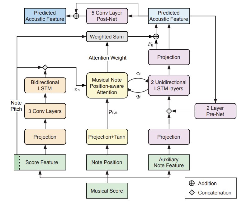 - 이는 각 decoder time-step에서 attention weight를 이용하여 phone-level input note pitch sequence를 weighting 함으로써 얻어짐