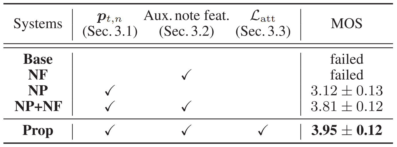 - 제안된 note position-aware attention이 SVS 성능 향상에 효과적임 - Guided attention loss까지 적용된 Prop은 가장 우수한 결과를 얻을 수 있음을 보임