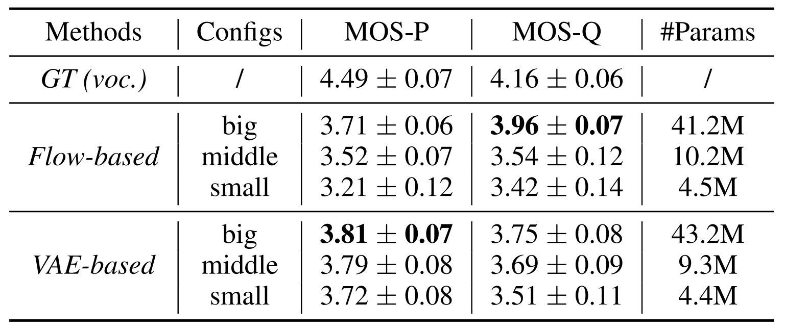 - MOS-P : 모델 capacity을 줄이면 flow-based 모델의 prosody가 크게 떨어지는 반면 VAE는 그 영향이 적음