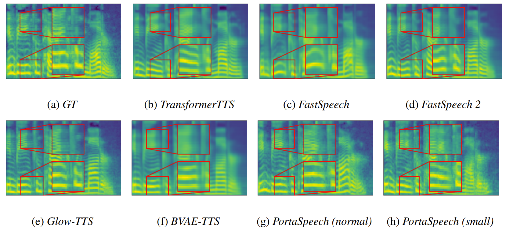 - 합성된 mel-spectrogram을 비교해 보면, PortaSpeech는 adjacent harmonics, unvoiced frame, high-frequency 등의 영역에서 detail 한 mel-spectrogram을 생성 가능