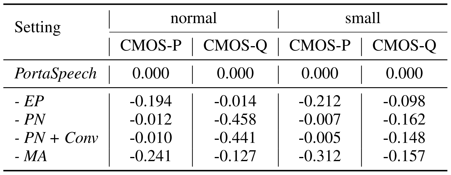 - 합성 품질 측면에서는 PortaSpeech (normal)이 기존 TTS 모델과 비교하여 가장 우수한 합성 품질을 보임