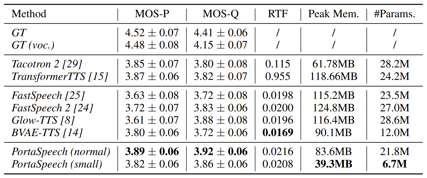 - 모델 size 측면에서는 PortaSpeech (small)이 가장 적은 parameter 수와 memory 공간을 필요로 함