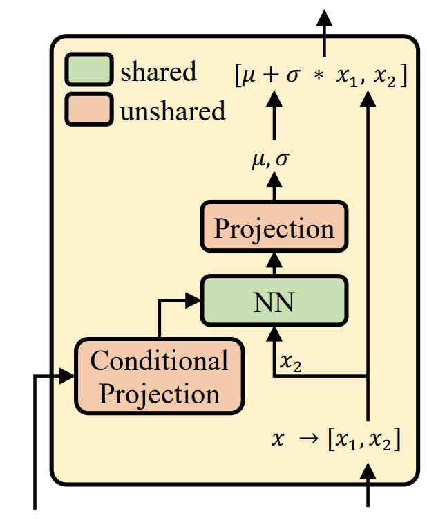 - 서로 다른 flow step의 unshared conditional projection layer가 step position을 나타낼 수 있으므로, flow indication embedding을 제거하여 더욱 단순화됨