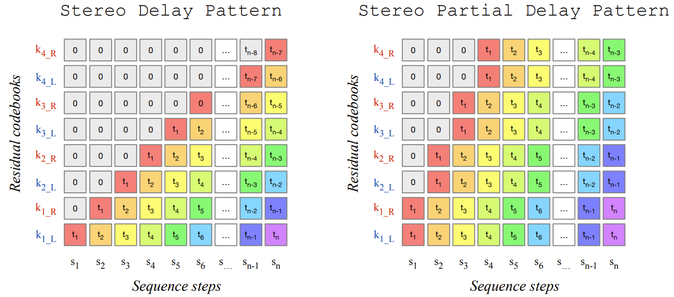 - Stereophonic data 생성으로 MusicGen을 확장하기 위해 delay pattern을 reuse 함