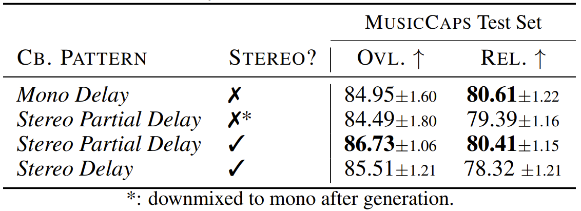 - Stereo partial delay가 Stereo delay pattern에 비해 전반적인 품질과 text relevance 모두에서 성능 향상을 보임