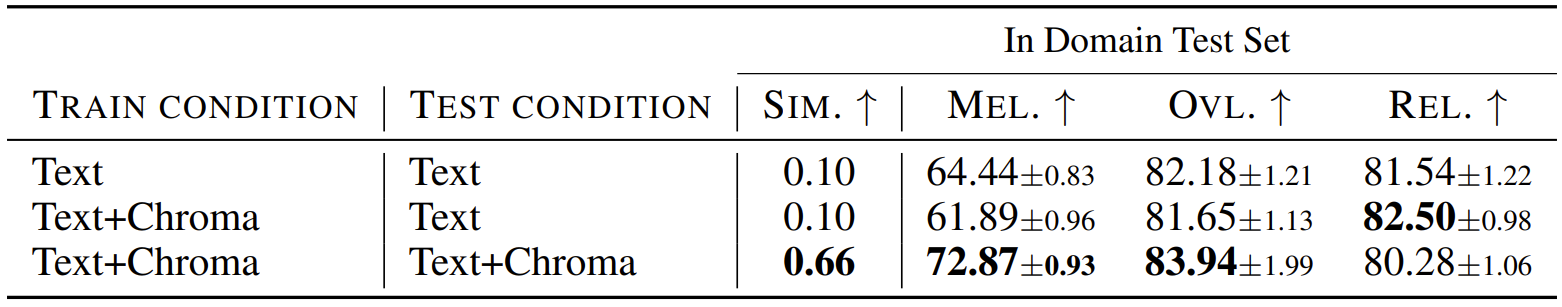 - 특히 MusicGen은 추론 시 chorma를 dropping 하는 것에 대해 robust 한 결과를 보임