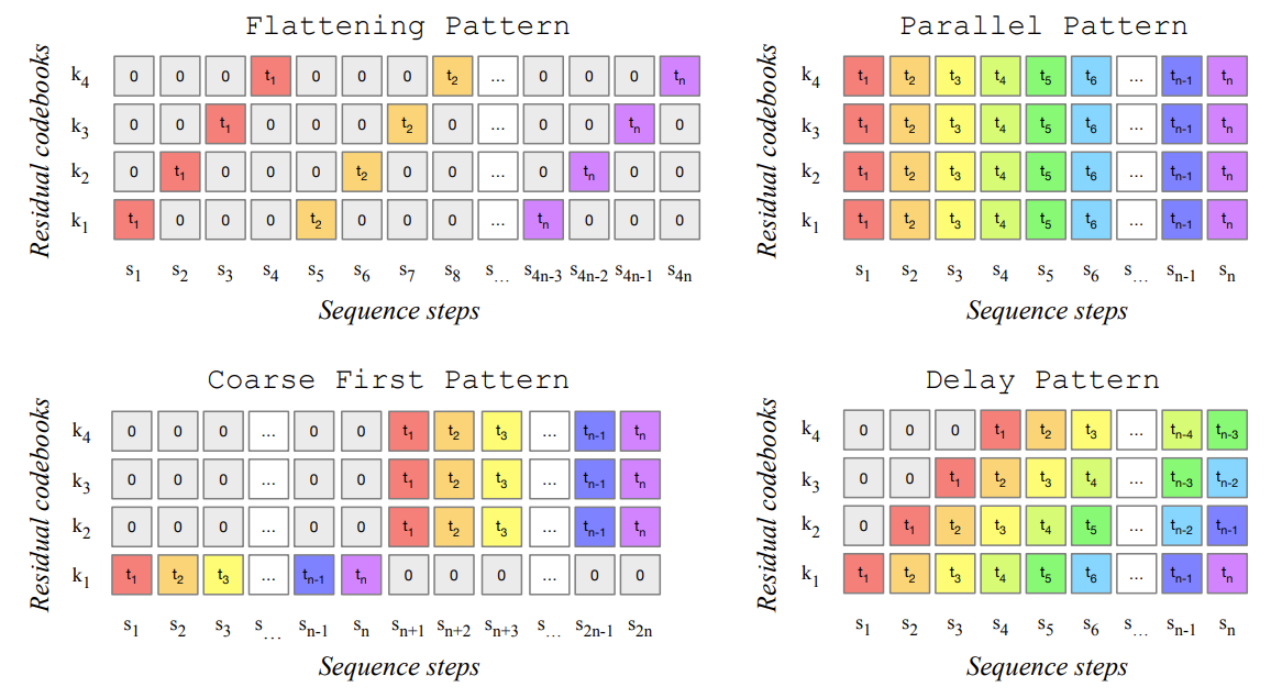 - 여기서 각 stream은 서로 다른 learned codebook에서 얻어지는 discrete token으로 구성됨 - 이러한 token을 모델링하기 위해, MusicGen은 codebook interleaving pattern을 generalize 하는 framework를 도입