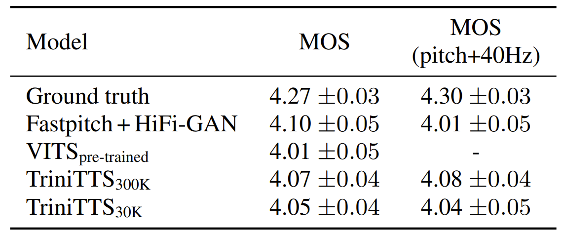 - 마찬가지로 TriniTTS는 기존 모델들과 비교할만한 성능을 보임