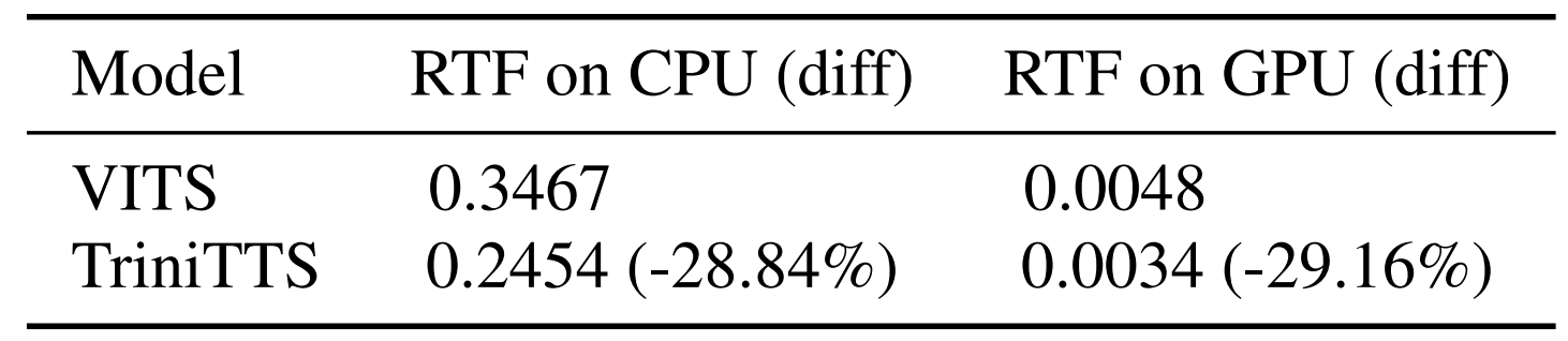 - 추론 속도 측면에서 TriniTTS는 CPU, GPU 환경 모두에서 VITS 보다 빠른 속도를 보임