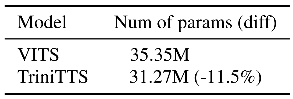 - Parameter 수 측면에서도 TriniTTS는 VITS 보다 효율적임