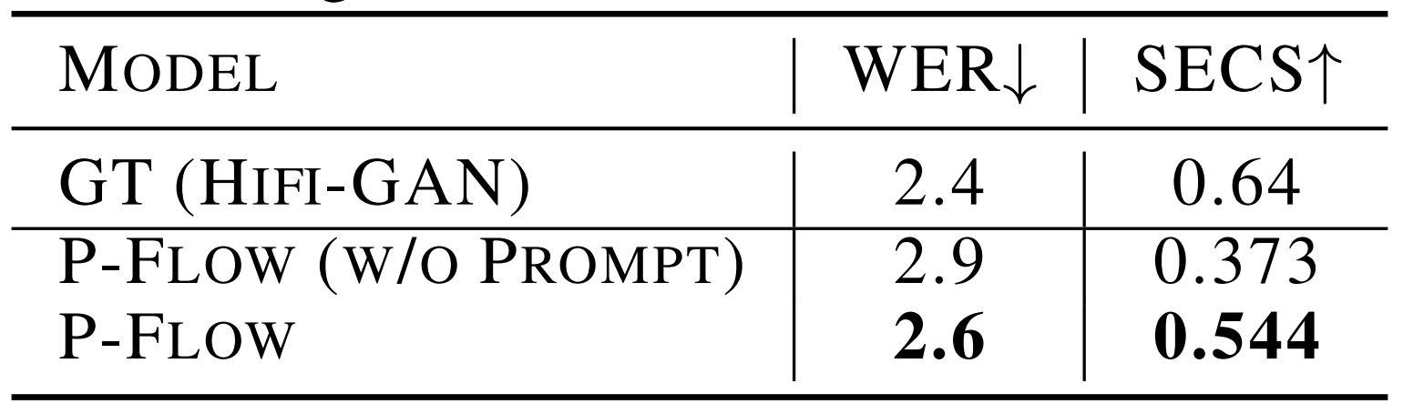 - 기존의 speaker embedding-based zero-shot TTS 모델에 비해 P-Flow는 speech prompting을 통해 더 효과적인 adaptation 성능을 보여줄 수 있음