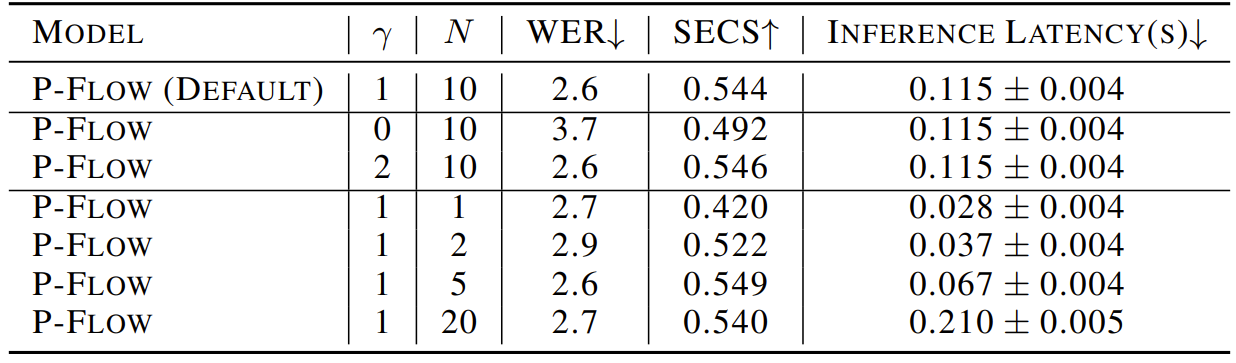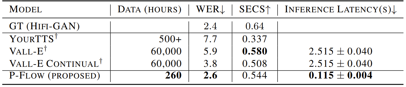 - Latency 측면에서도 P-Flow는 VALL-E 보다 20배 빠른 0.1초의 latency를 보임