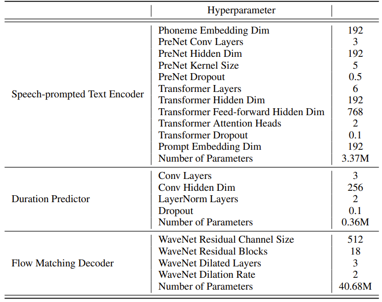 - 이때 주어지는 representation에는 이미 speaker information이 포함되어 있으므로, 추가적인 speaker conditioning 없이 speech-prompted text encoder의 hidden representation을 input으로 사용
