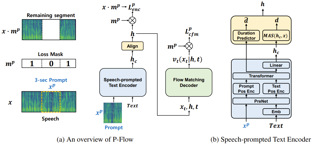 - 이때 $x^{p}=(1-m^{p})\cdot x$라고 하면 $p$는 zero-shot 추론 중에 variable이 arbitrary한 3초의 prompt로 대체됨을 의미 - P-Flow의 training objective는 주어진 $c$와 segment $x^{p}$를 통해 $x$를 reconstruct 하는 것