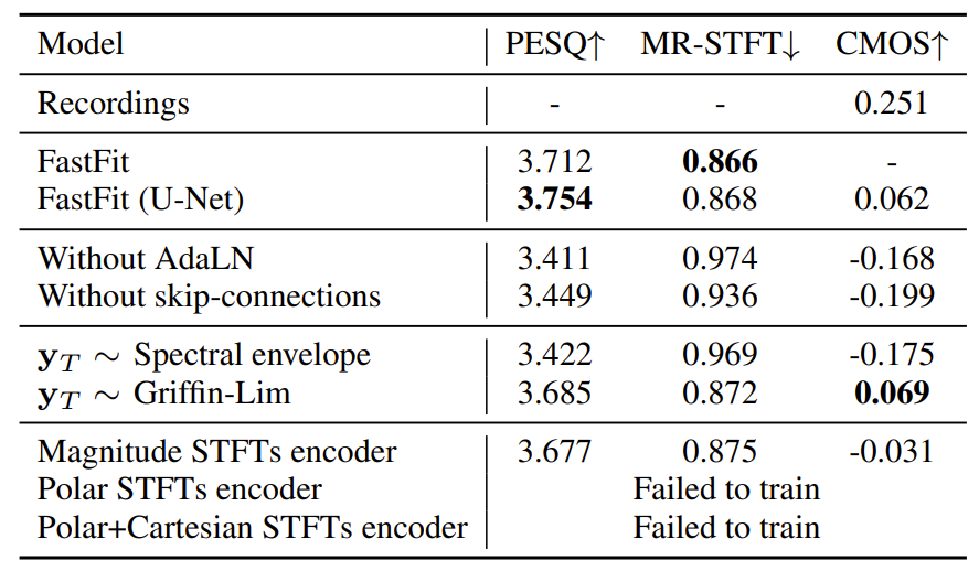 - Representation으로 사용된 magnitude spectrogram은 FastFit에서 사용된 Cartesian form과 정량적인 metric 측면에서는 큰 차이를 보이지 않음