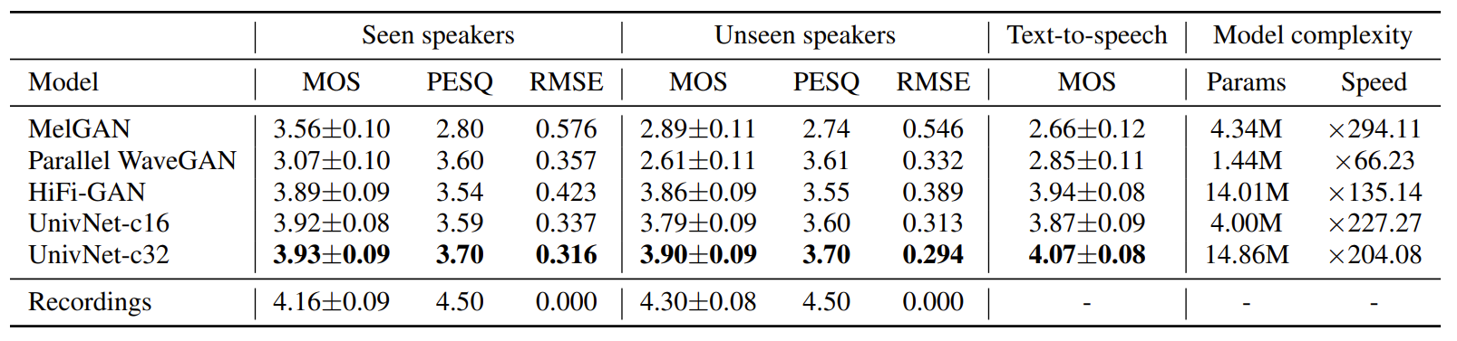 - 전체적인 합성 품질 측면에서도 UnivNet이 가장 우수한 것으로 나타남