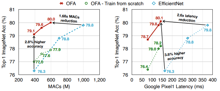 - OFA가 hardware에서 EfficientNet 보다 빠르게 실행됨