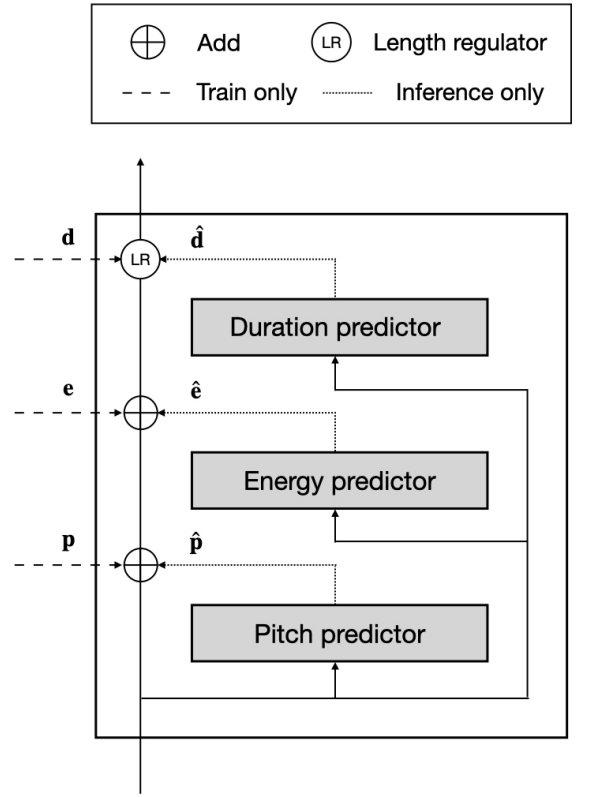 - $\mathbf{d}, \mathbf{p}, \mathbf{e}$ : ground-truth duration, pitch, energy feature sequence