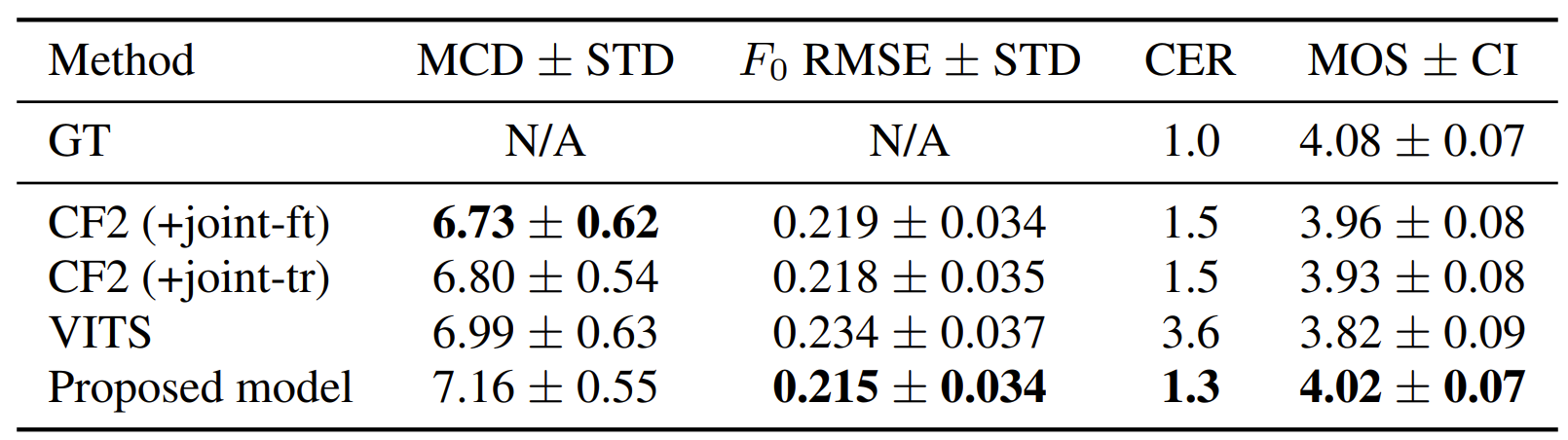 - Comparisons : ESPNet2-TTS (CF2), VITS