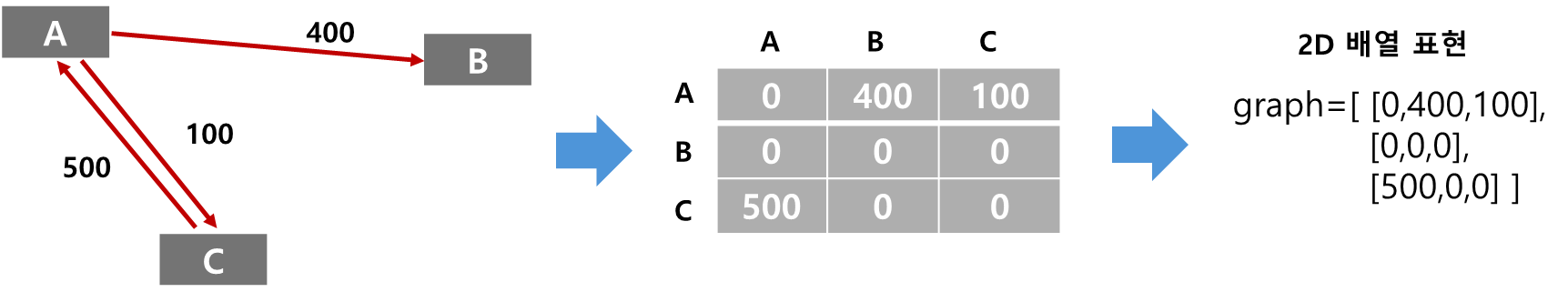 `graph = [[0,400,100], [0,0,0], [500,0,0]]` - 노드 수를 $V$라고 했을 때 간선 정보를 저장하기 위해서 $O(V^{2})$ 만큼의 메모리가 필요하지만, 간선 비용을 $O(1)$의 시간으로 조회할 수 있음