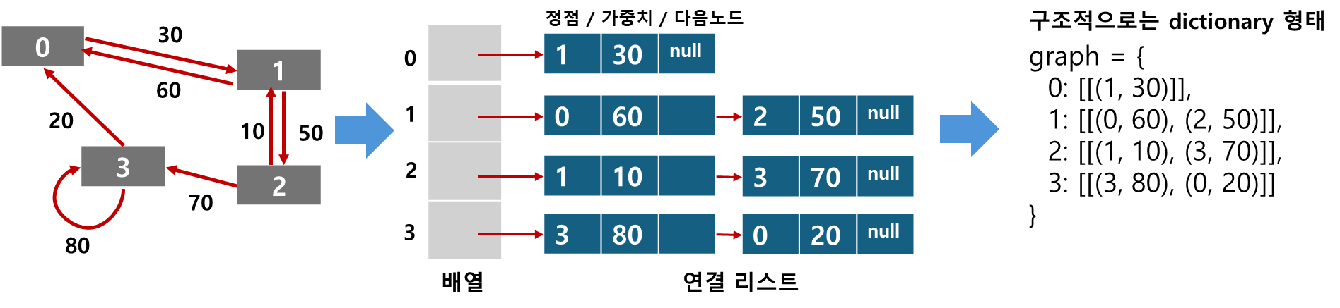 - 노드, 가중치, 다음 노드에 대한 정보를 연결 리스트로 만들어 나타내는 방식